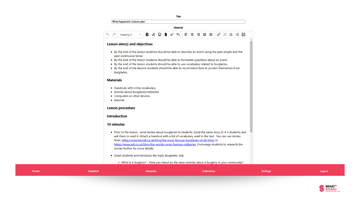With the Collection, Braid Studio aims to empower ELT professionals by providing them with the resources they need to create engaging, culturally sensitive, and adaptable learning experiences. It’s about giving educators the tools to foster a learning environment that is not only informative but also inclusive and inspiring. By combining the power of AI with the insights of human educators, Braid Studio’s "Collections" stands as a testament to how technology and human expertise can work hand-in-hand to elevate learning experiences.